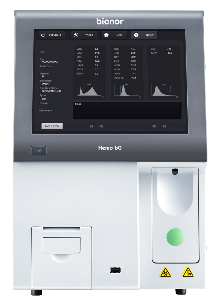 Hemo 60 are used to count and identify blood cells at high speed and accuracy. Hemo 60 analyzers are used to conduct a complete blood count (CBC), which is usually the first test requested by physicians to determine a patients general health status. A complete blood count includes red blood cell (RBC), white blood cell (WBC), hemoglobin, and platelet counts, as well as hematocrit levels.